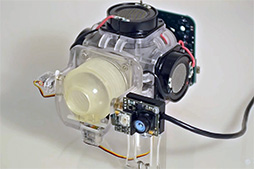 RO RMT「AIREAL」(エリアル)と呼ばれるこのシステムは,一辺が8cm程度の立方体型エンクロージャに,蛇腹状のノズルが付いたものだ。このノズルはモーター制御で上下左右に動き,ノズルが向いた方向に,リング状の渦(空気振動)を発射する。