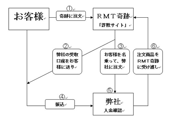 さて、この度弊社受取口座を無断で悪用した詐欺サイト「RMT奇跡」(rmt-kiseki.jp)の存在が確認されております。