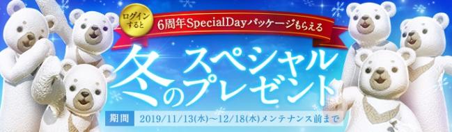 11月13日(水)より、2019年の感謝の気持ちを込めて「冬のスペシャルプレゼント」を開催いたしました。11月13日(水)から12月18日(水)までのキャンペーン期間中、ゲーム内にログインし、ログイン条件を達成してくださった方全員に、武器の強化に使用できる強化剤や労働力を追加回復するポーションなど、豪華アイテムを詰め合わせた「6周年SpecialDayパッケージ」をお贈りいたします。この機会に是非『アーキエイジ』をお楽しみください。