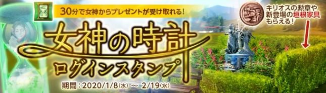 1月8日(水)より、「女神の時計ログインスタンプ」イベントを開催いたしました。イベント期間中、ログインしてから30分後に「女神の贈り物」がもらえます。「女神の贈り物」を開封すると、必ず「女神のコイン」が入手でき、さらに通常はアリーナでの結果に応じて配布される「キリオスの勲章」などがランダムで獲得できます。