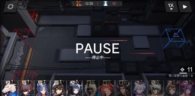 でも『アークナイツ』では心配ご無用。なぜならバトル中のポーズ機能が搭載されているからです。右上の一時停止ボタンをタップでポーズ状態になります。