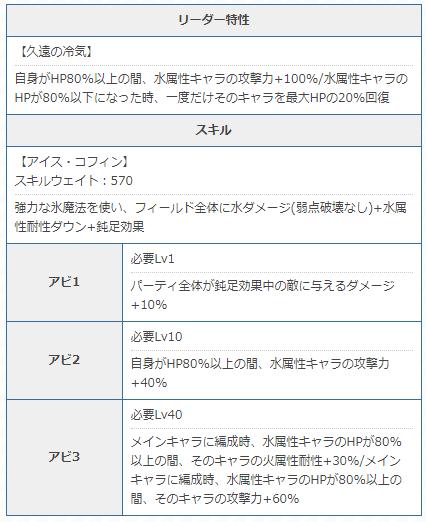 スキルは敵全体に水耐性ダウンと鈍足効果を与えるもの。さらにアビリティでは鈍足効果中の敵に与えるダメージが増加するため、攻撃力とは別に味方全体のダメージを底上げしていけるのが強い。