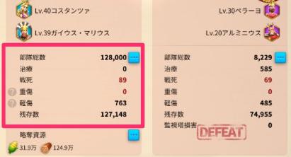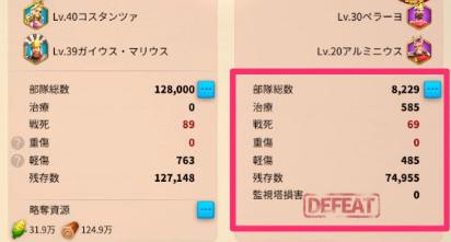 防衛側は重傷兵の半分が戦死するのに対して、攻城側は全ての重傷兵が戦死してしまう。同戦力で戦闘を行った場合、攻城側の方が戦力を大きく消耗することを覚えておこう。