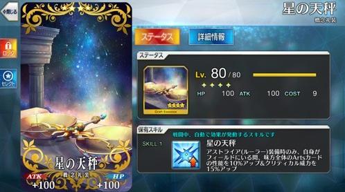 そして手に入れたのが専用礼装の〝星の天秤”ですね。嫁ネロやパラケルススと同じような運用で補助に回ることも多いアストライアですから、この礼装はまだ活きる感じですかね。アーツパでクリティカルを決めたい際には重宝すると思うので、うちだとラムダなんかを補助する際に有用、なのかなぁ?