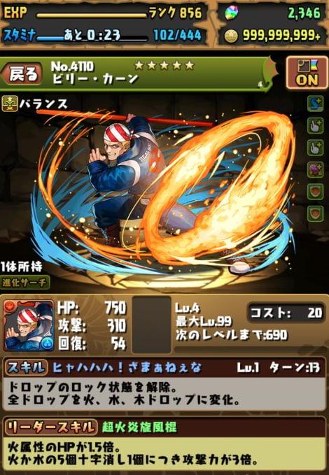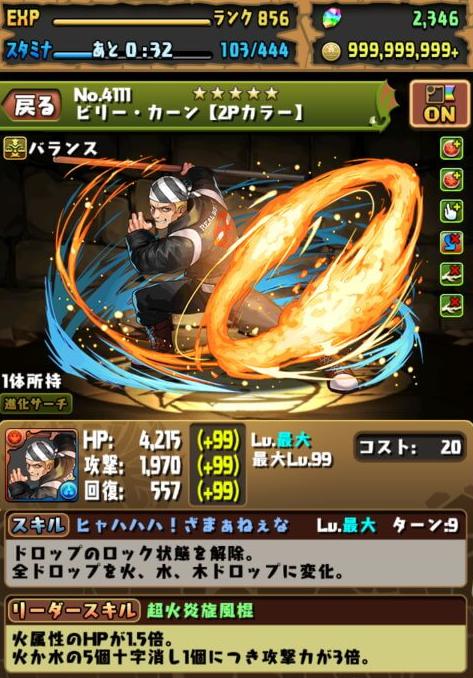 “ビリー・カーン【2Pカラー】”の特徴は、最短9ターンで発動することができるスキル(ドロップのロック状態を解除。全ドロップを火、水、木ドロップに変化。)です。