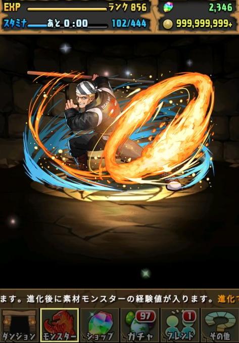 リーダースキルは【超火炎旋風棍(火属性のHPが1.5倍。火か水の5個十字消し1個につき攻撃力が3倍。)】のままで変わっていません。